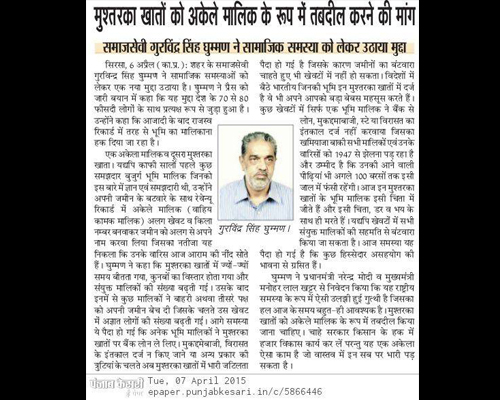 Since 1947, the ownership of rural land in the revenue records has been of two types: either as a individual ownership of the specific kila numbers on his name or as a share-holder of the property, known as mushtarka khata.People who had knowledge of the revenue details were smart enough to address the problem.They went ahead and got the required changes in the government records as legally mandated. Individuals who were ignorant or less aware of these requirements could not get these changes in order to have clear possession of their special Kila number of land. This led the revenue records to show multiple legal shareholders. It is now four generations since partition; further selling of the land to different people has led to unknown partners and has caused a lot of confusion and complications in the legal documentation. The need of the hour is to take drastic steps to make amends. Just like the Swachh Bharat Abhiyan, the govt led by our Prime Minister should personally analyze,revise and systematize the policies regarding clear title of land ownership to resolve this matter. This can be made possible by the combined efforts of the Govt, District Commissioner, District Magistrate, SDM, Tehsildar and most importantly Patwaries The government should take measures to streamline the revenue records according to sound landholder policies to stop further complications to the present generations of land holders.Let’s together join in the movement to initiate steps towards fruitful results towards getting the land records right.
